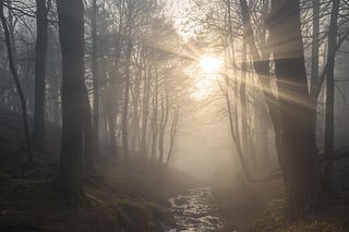Imagine a fog-covered woodland at dawn.